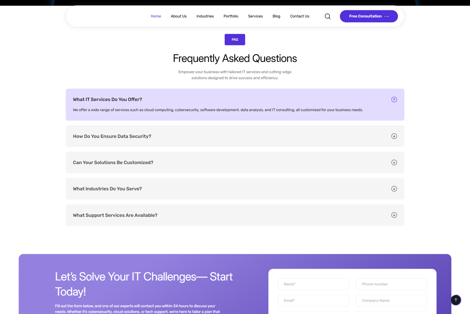 Typography, iconography, and motion effects deliver a premium corporate image aligned with global IT consultancies.