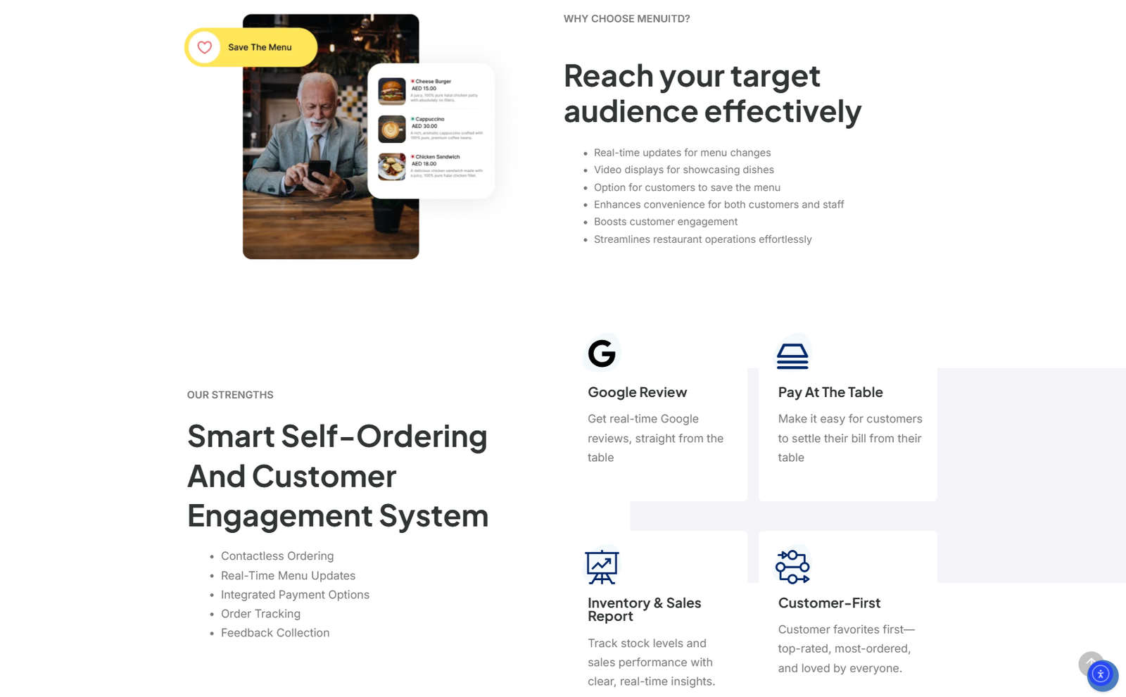 We designed the website with a clean SaaS aesthetic—bold typography, product screenshots, and strong call-to-action elements. Each section was crafted to highlight MenuITD’s efficiency, speed, and operational benefits for restaurant owners.