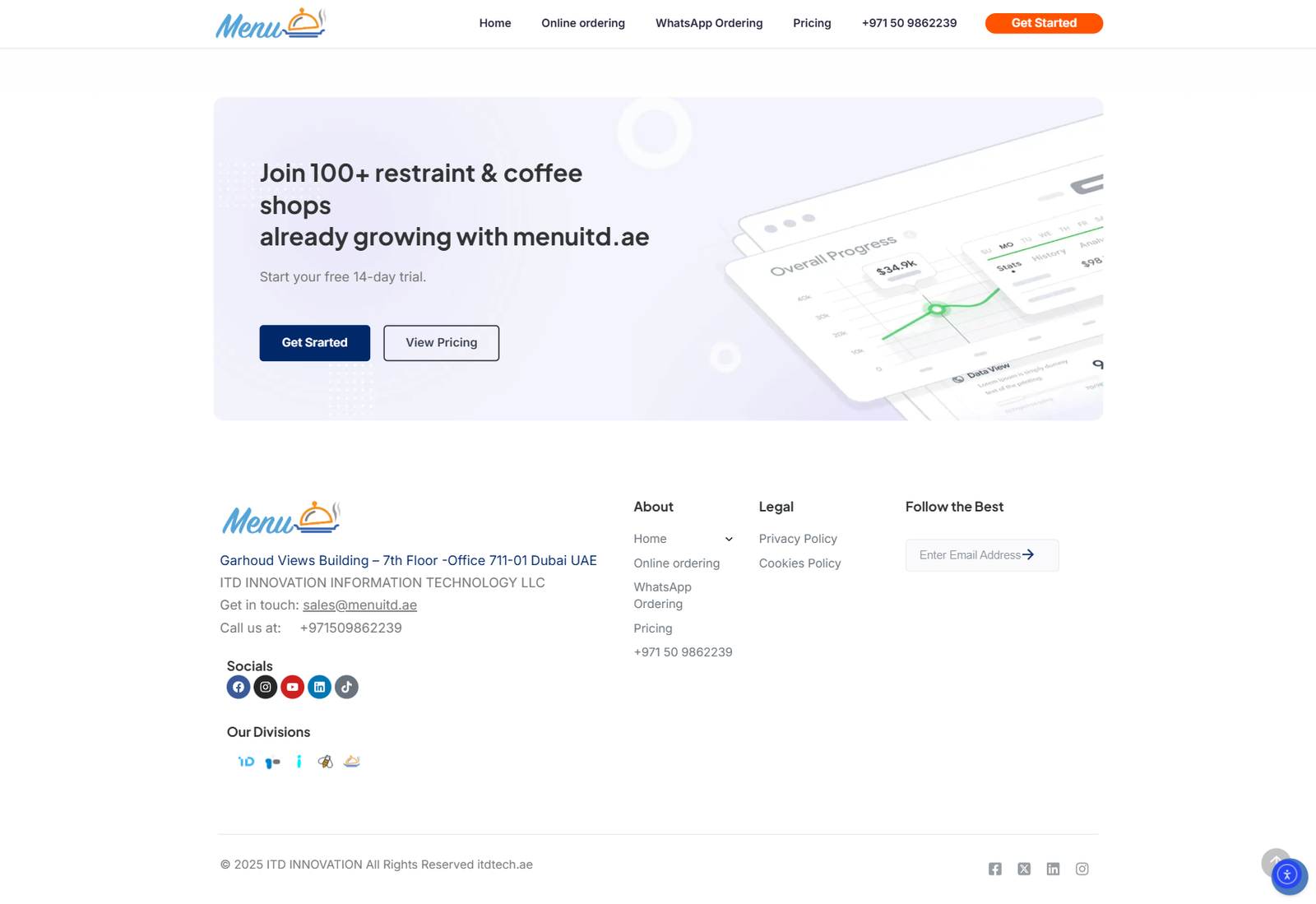 MenuITD is a powerful online ordering and digital menu platform designed for restaurants, cafés, food trucks, and cloud kitchens across the UAE. Built to streamline operations with instant payments, AI-driven menus, and real-time customer engagement, MenuITD needed a website that truly reflects the innovation behind the product.