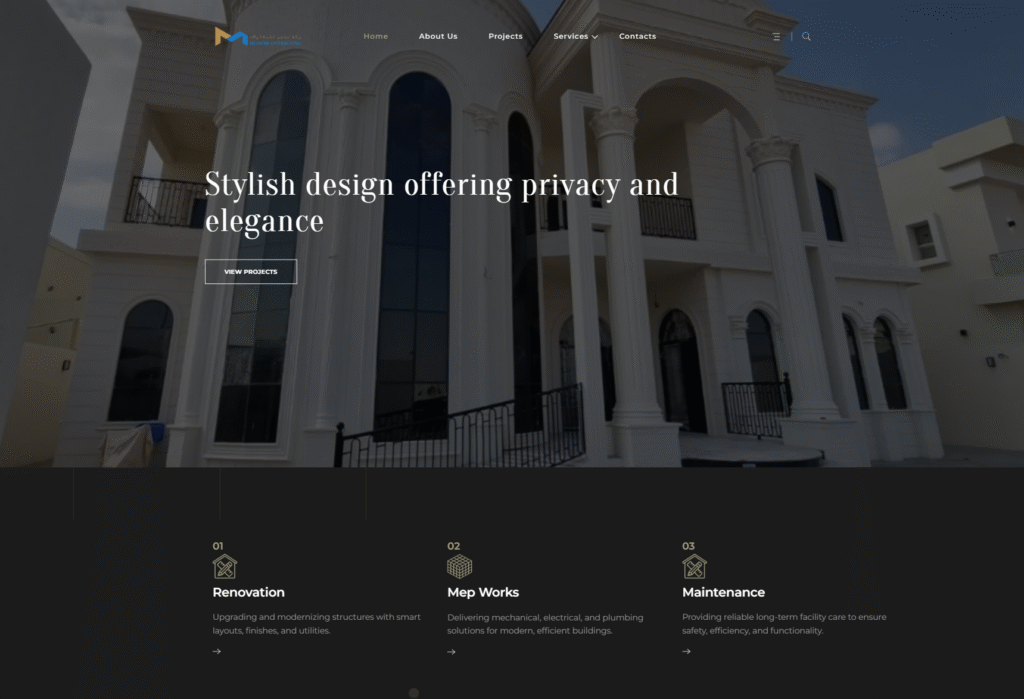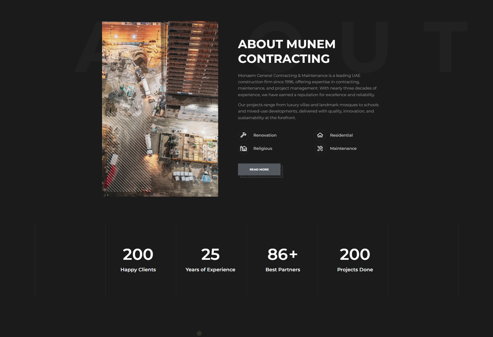 Munem General Contracting & Maintenance is a long-standing construction company operating in the UAE since 1996. With nearly 30 years of expertise, they have delivered landmark mosques, luxury villas, schools, and mixed-use developments. Their brand needed a modern, professional website that reflects the scale of their experience and the quality of their work.